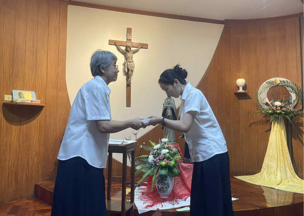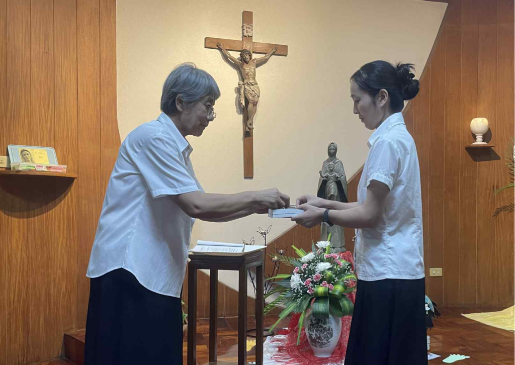 La Maestra de Novicias, Elisa Huang FI, fue la responsable de admitirla al noviciado. En esta sencilla y profunda celebración, se le entregaron las Constituciones y un crucifijo, signos profundos de identidad, seguimiento y pertenencia a la Congregación de las Hijas de Jesús.